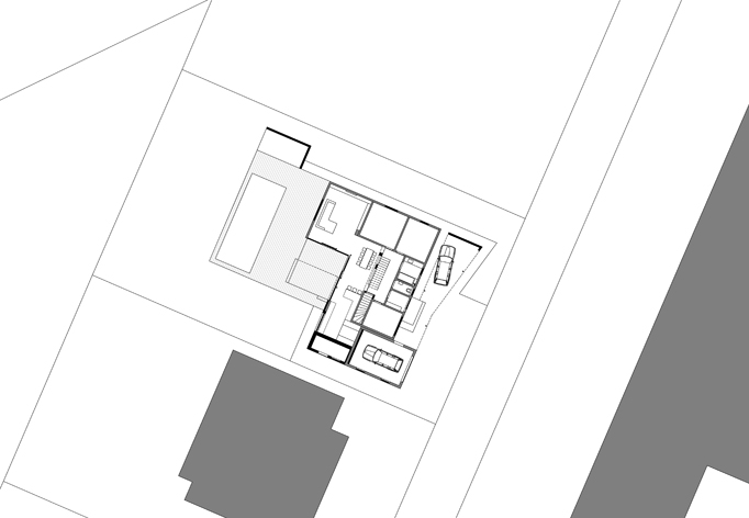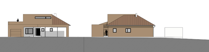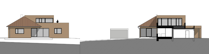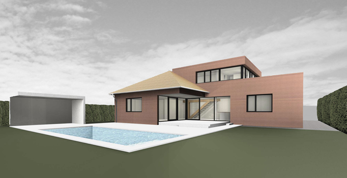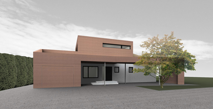 Ein bestehender Bungalow aus den 90er Jahren wird erweitert. Küche und Essbereich werden vergrößert und zum Garten geöfffnet, in der Mitte des Erdgeschoßes wird eine offene Treppe ergänzt, die neuen Privatbereich erschließt. Straßenseitig bildet die Verbindung eines neuen Carports mit der bestehenden Garage eine neue Eingangssituation. Die Farbe der Fassade nimmt Bezug auf das bestehende, rote Ziegelwalmdach.