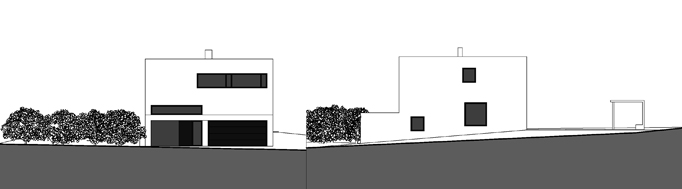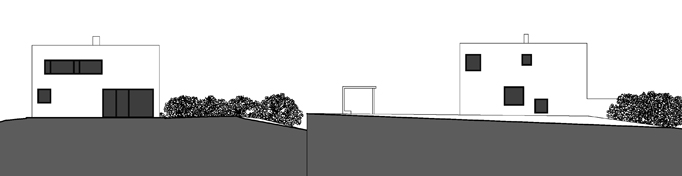 Der Wohnraum orientiert sich in Richtung bebaungsfreie Landschaft, Nachbargebäude werden weitestgehend ausgeblendet. Die Höhenentwicklung des Gebäudes reagiert auf das vorgefundene Grundstück mit einer Halbgeschoßlösung. Die ebene Zufahrt und der ebene Ausgang zur Terrasse vermitteln Großzügigkeit. Das umfangreiche Raumprogramm ist kompakt in den exakt quadratischen Grundriss des Hauptgebäudes verpackt.