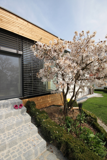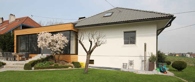 Erneuerung eines Zubaus in Leichtbauweise. Durch gezielte Positionierung eines Oberlichts und den Einsatz von beweglichen Sonnenschutzlamellen wurde ein optimales Verhältnis von Belichtungsflächen und steuerbarer Erwärmung des neuen Wohnraumes erreicht.