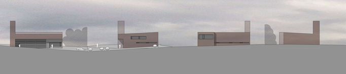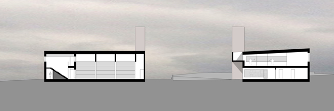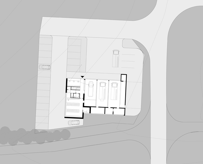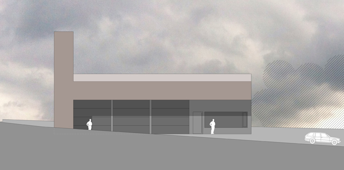 Das Gebäude orientiert sich funktional an der im Norden gelegenen Haupterschließung des Grundstücks. Bei der Straßenanbindung wurde besonders darauf geachtet, dass die geplante Erschließung des Grundstücks auf bestehendem Niveau bleibt. Die Zu- und Ausfahrt für die Feuerwehr wird so angelegt, dass möglichst kurze und klare, sich nicht kreuzende Wege entstehen. Die klare Konzeption der unterschiedlichen thermischen Zonen im Gebäude erleichtern das Realisieren eines hochenergieeffizienten Gebäudes. Die kompakte Form spart Oberfläche, Material und Energie. Die tragende Struktur wird in Massivbauweise ausgeführt. Die Fassade wird verputzt. Im Eingangsbereich sorgt eine Alu-Sandwich-Plattenfassade für höhere Widerstandfähigkeit und ein leichtes Einbinden der Garagentore.