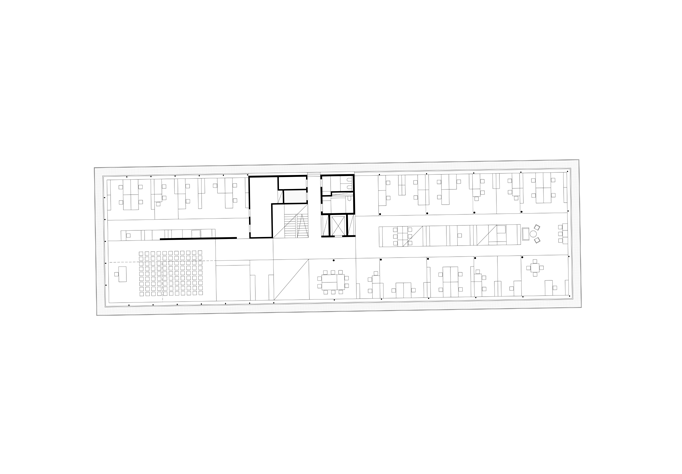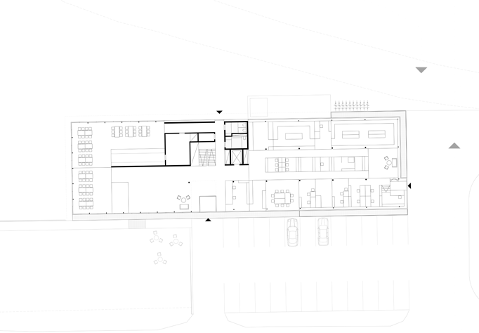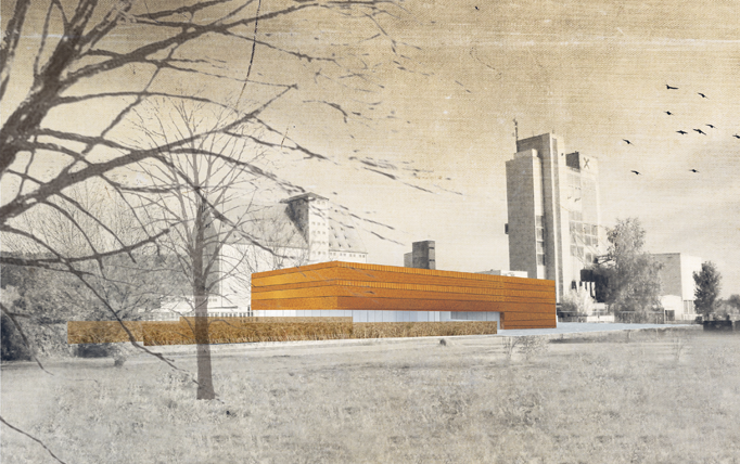 Das Gebäude bildet ein Tor zum Betriebsareal. Um die Erschließung leicht ablesbar zu machen, wird der Baukörper gezielt geöffnet, seine Höhenentwicklung stellt eine Verbindung zur umliegenden Bebauung her. Eine offene, lichtdurchflutete Treppe, welche zentral situiert ist, sorgt für kurze Wege und verbindet Ausstelungsflächen und Wartebereiche unmittelbar miteinander. Die Erschließung auf dem Gelände ist ebenfalls klar gegliedert. Die LKW- Parkierungsflächen sind so gestaltet, dass von der Ankunft über die Warte-, Ablade- und Abfahrtszeit keine Stauzonen entstehen. Die Fassade aus Cortenstahl Streckmetall sorgt für einen wartungsarmen, windsicheren Sonnenschutz und eine unverkennbare Wirkung.