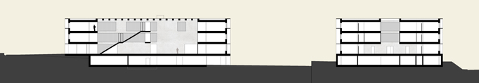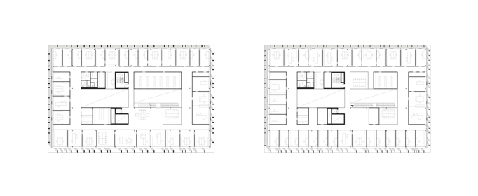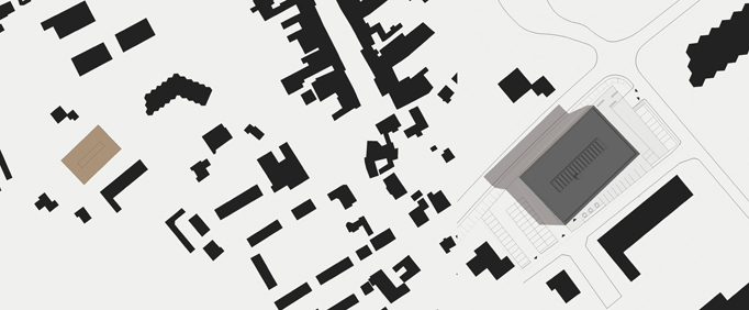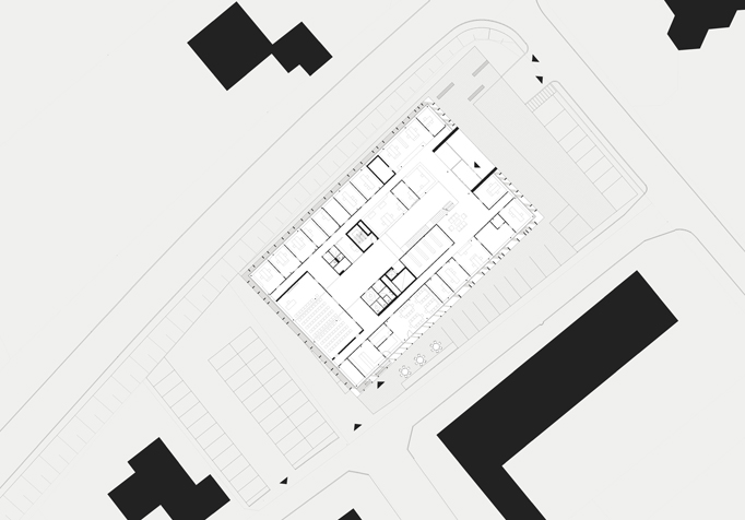 Der Eingangsbereich der neuen Bezirkshauptmannschaft liegt an der Grillparzerstraße, gut von der B138 einsehbar. Das Gebäude wird von der sehr breiten Nordostfassade erschlossen und bildet durch seine raumbildende Dimension ein Gegenüber zur Altstadt. Dieses Verhältnis wird durch den bestehenden Fußweg vom Parkplatz an der Bundesstraße in die Innenstadt als direktes Gegenüber des Amtsgebäudes verdeutlicht. Eine spätere Neunutzung oder Neubebauung des jetzigen BH Areals kann diese Situation unterstreichen. Das Volumen kommt mit drei Vollgeschoßen aus, was für einen sehr kompakten Baukörper sorgt und städtebaulich eine starke und definierte Struktur erzeugt.