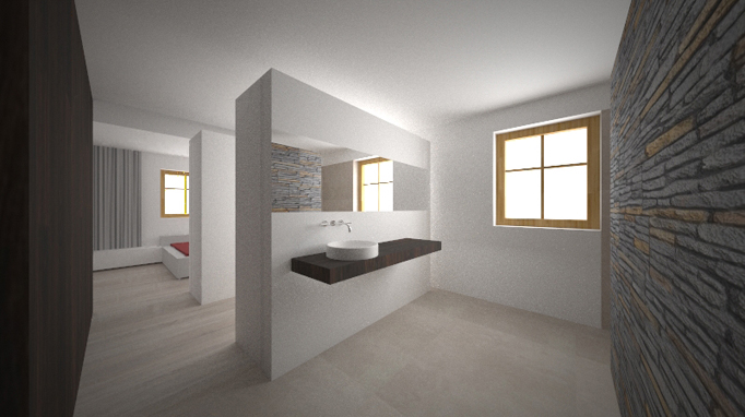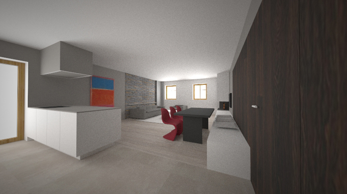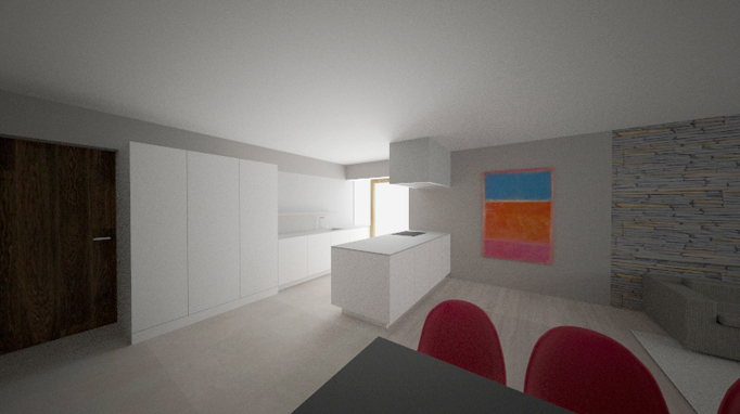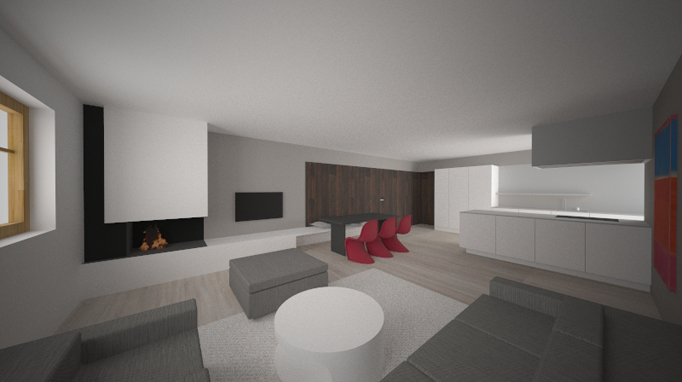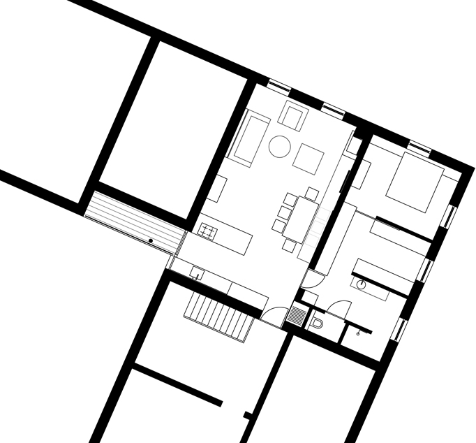 Ein schonender Umgang mit der bestehenden Bausubstanz wird durch gezieltes Ergänzen von notwendigen Belichtungsflächen möglich. Die eingefügten Elemente leben von einer schlichten Geometrie und ausgewählten Materialien. Das Herzstück der Wohnung bildet der offene Ess- und Wohnbereich. Die einzelnen Funktionen dieses Raumes greifen Lückenlos inneinender und bilden ein gut nutzbares Ganzes. Fast genauso offen wie der Wohnbereich präsentiert sich der Privatbereich. Zur Gänze versenkbare Schiebetüren ermöglichen ein großzügiges Raumgefüge sowie Privatsphäre bei Bedarf.